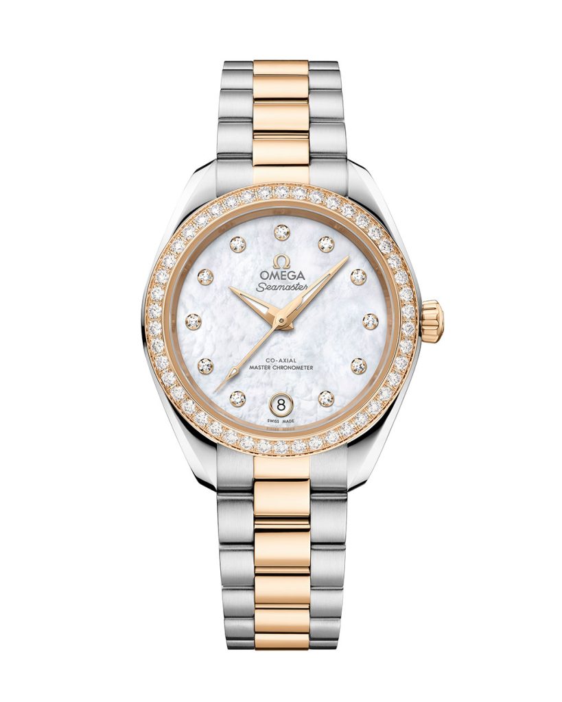 Jutta draagt een Omega Aqua Terra van 30 mm in Moonshine Gold, met een parelmoeren wijzerplaat en diamanten bezel. Geen subtiel klokje dus, maar een statement op haar pols. - Waarom werkt Jutta Leerdam samen met OMEGA?